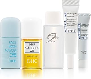 DHC Favorites Mini-Set, einschließlich Tiefenreinigungsöl, Gesichtspuder Mini, milde Lotion Mini, extra Nachtfeuchtigkeit Mini und konzentrierte Augencreme Mini